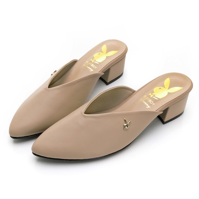 PLAYBOY 玩美小時光 經典時髦V口粗跟穆勒鞋-杏-YD9012JA