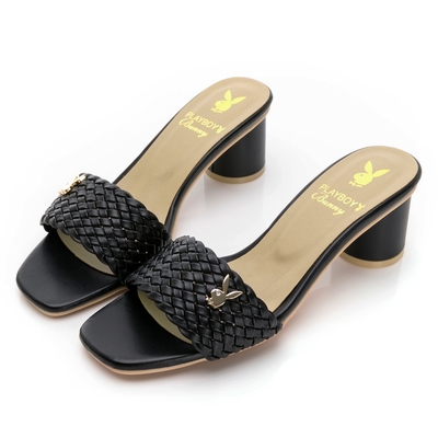 PLAYBOY 優雅氣息夏日編織粗跟涼拖鞋-PY0070黑