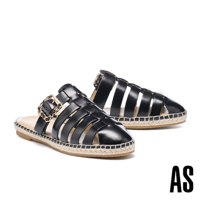 穆勒鞋 AS 率性時髦穿鍊方釦魚骨造型牛油皮草編厚底穆勒拖鞋-黑