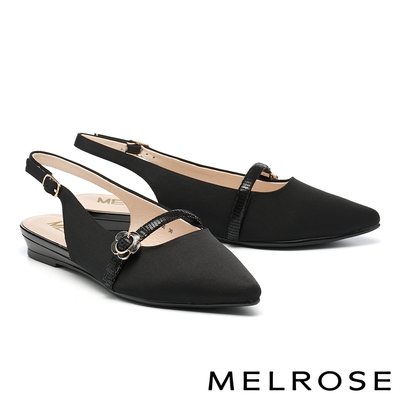 低跟鞋 MELROSE 美樂斯 氣質花朵釦拼接萊卡布後繫帶尖頭低跟鞋-黑