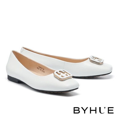 平底鞋 BYHUE 簡約優雅飾釦羊皮方頭軟芯Q底平底鞋-白