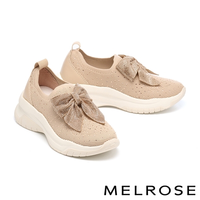 休閒鞋 MELROSE 美樂斯 輕奢閃讚蝴蝶結飛織布拼接牛皮厚底休閒鞋-杏