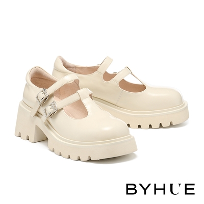 厚底鞋 BYHUE 時髦珍珠方釦繫帶全真皮軟芯瑪莉珍方頭厚底鞋-米白