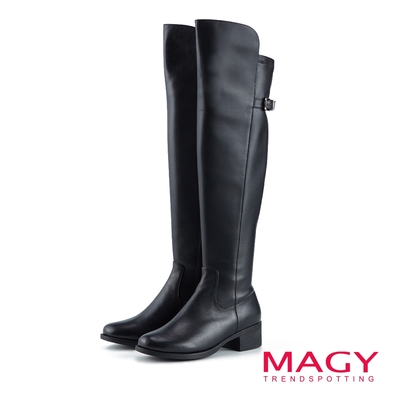 MAGY 皮帶釦飾側拉鍊真皮粗跟長靴 黑色