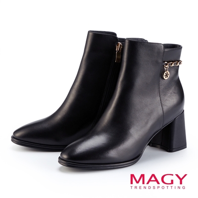 MAGY 金屬鍊飾拉鍊真皮粗跟短靴 黑色