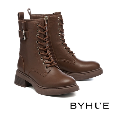 短靴 BYHUE 率性時尚方釦繫帶牛皮綁帶軟芯厚底短靴-棕