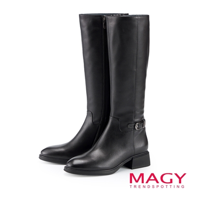 MAGY 皮帶釦飾側拉鍊真皮粗跟長靴 黑色