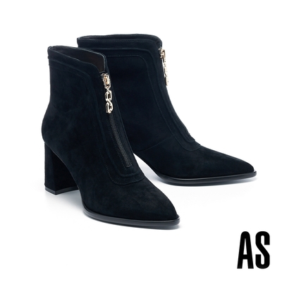 短靴 AS 時髦新經典LOGO拉鍊羊麂皮尖頭高跟短靴-黑