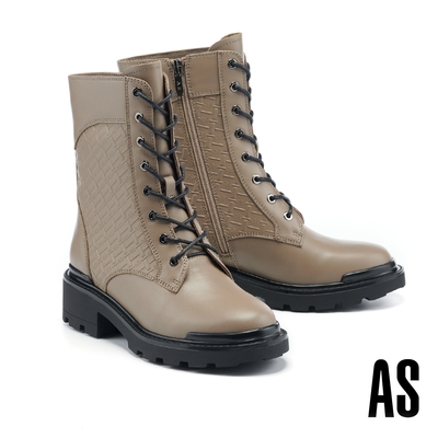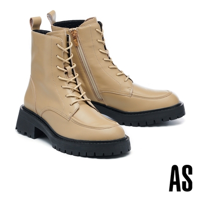 短靴 AS 率性街頭風LOGO拉鍊綁帶牛皮厚底短靴-杏