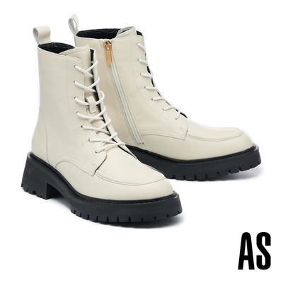 短靴 AS 率性街頭風LOGO拉鍊綁帶牛皮厚底短靴-米