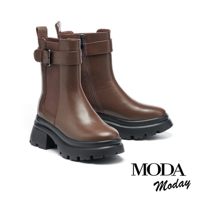 短靴 MODA MODAY 率性復古方釦帶牛皮切爾西厚底短靴-咖