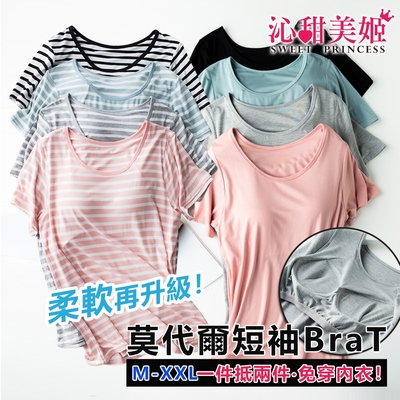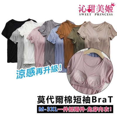 涼感M-3XL大尺碼莫代爾帶胸墊BraT短袖(BraTop 免穿內衣 T恤 休閒服 運動服 家居服 睡衣/舒適)$398