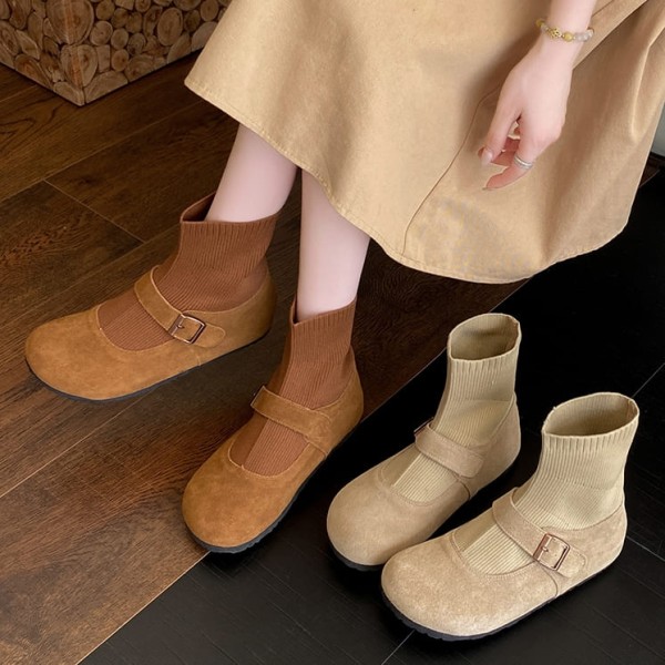 【35-42全尺碼】襪靴.簡約絨面一字帶拼接襪套式圓頭短靴.白鳥麗子