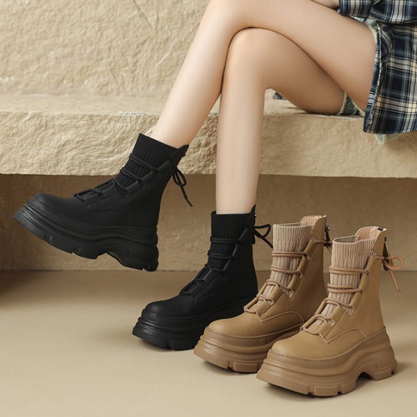 厚底靴.率性皮革針織拼接繫帶後拉鍊短靴.白鳥麗子