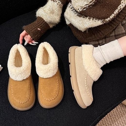雪鞋.雜誌款絨布麂皮毛毛邊平底圓頭踝靴.白鳥麗子