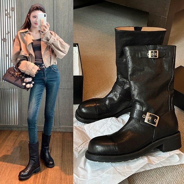 山打努SANDARU-中筒靴 率性皮帶扣低跟騎士褲管靴-黑