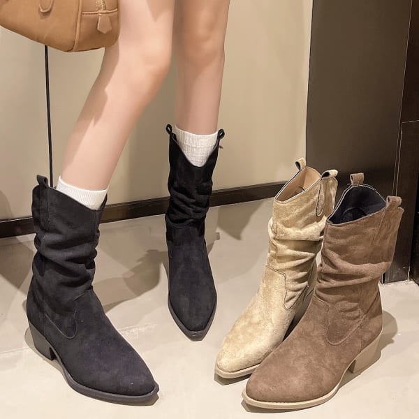 商店中筒靴.率性V口素色絨布抓皺尖頭粗跟靴.白鳥麗子
