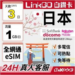 LINKGO白鑽卡 日本全網通 eSIM卡 3天上網每日1GB 多電信(日本網卡 東京 大阪 福岡 北海道 沖繩)$103