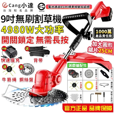 Cang小達 割草機 9吋無刷割草機 送牛津繩 4980W大功率 充電式電動割草機 電池認證BSMI:R3E558(品牌保固)十五節兩電+全套配件$3,909$4,029