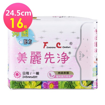 機能性保養專利 照顧私密不煩惱FC美麗先淨 草本抑菌衛生棉 24.5cm 日用 8片/包 X16包$6495(1)升級購券贈品