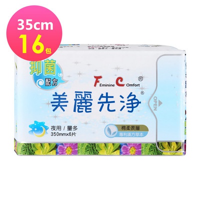 機能性保養專利 照顧私密不煩惱FC美麗先淨 草本抑菌衛生棉 35cm 夜用 6片/包 X16包$649升級購券贈品