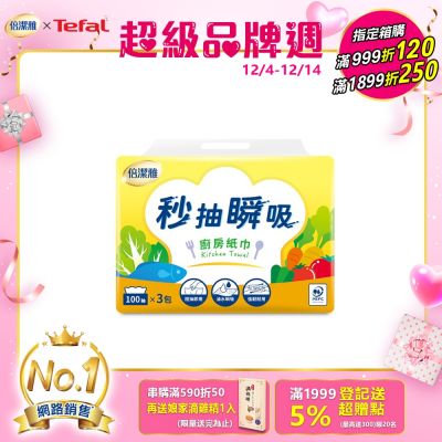 倍潔雅秒抽瞬吸抽取式廚房紙巾-100抽3包/袋
