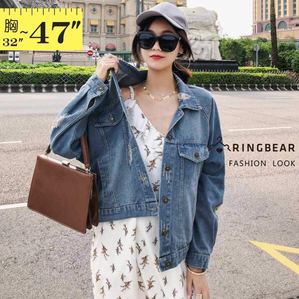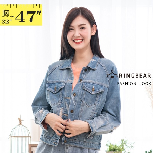 加大碼外套-顯瘦水洗刷破感牛仔外套(S-4XL)