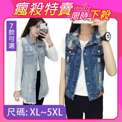 商店背心外套--個性休閒寬鬆顯瘦毛邊破洞牛仔背心(藍L-4L)-J397眼圈熊中大尺碼