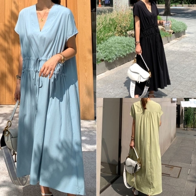 MOCO法式優雅V領素色腰綁帶抽繩寬鬆長版過膝洋裝XL~5XL