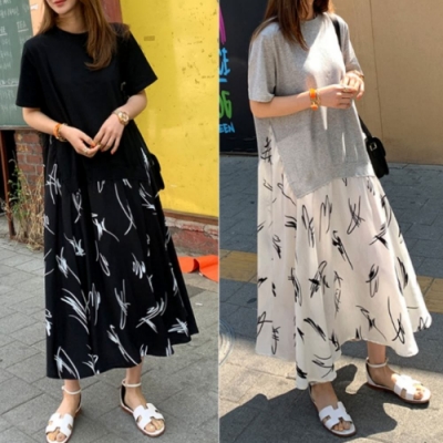 MOCO圓領棉質拼接側開叉線條雪紡大擺裙假兩件式洋裝XL~5L