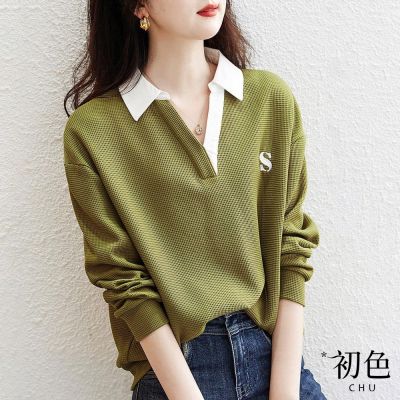 初色 假兩件式格紋字母貼布長袖POLO衫T恤-共2色-31055(M-2XL可選)