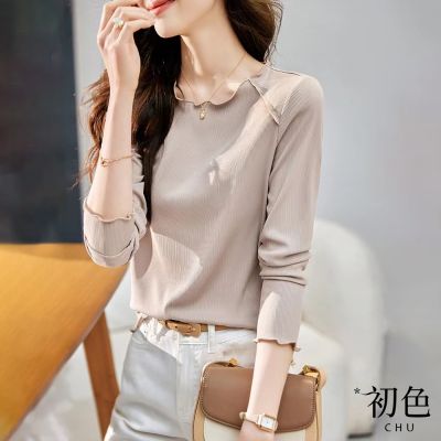 初色 純色修身顯瘦木耳邊圓領簡約長袖針織衫女上衣-奶咖色-30277(M-2XL可選)