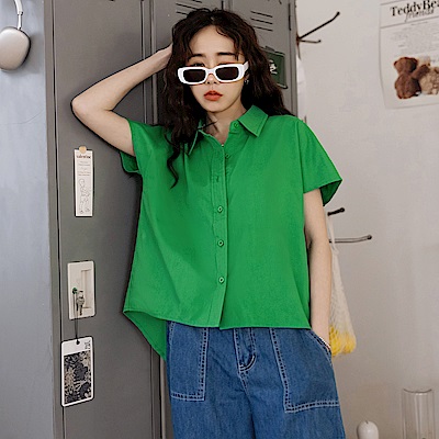純棉素色前短後長連袖短袖襯衫-OB嚴選