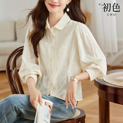 初色 輕熟風中式簡約繡花修身翻領長袖純棉襯衫上衣女上衣-共2色-11310(M-2XL可選)