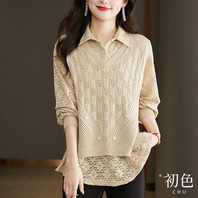 初色 翻領蕾絲拼接假兩件寬鬆薄款針織上衣-共5色-67053(M-2XL可選)$369