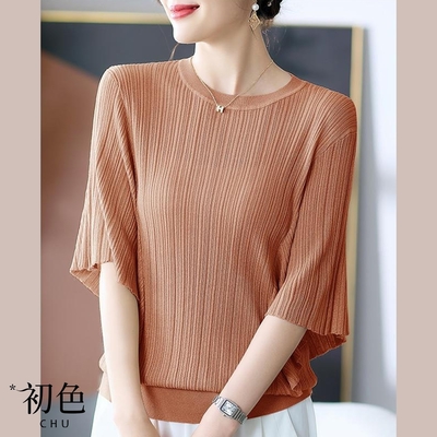 初色 素色五分袖短袖修身圓領拼接薄款針織衫上衣-共4色-68378(F可選)$269