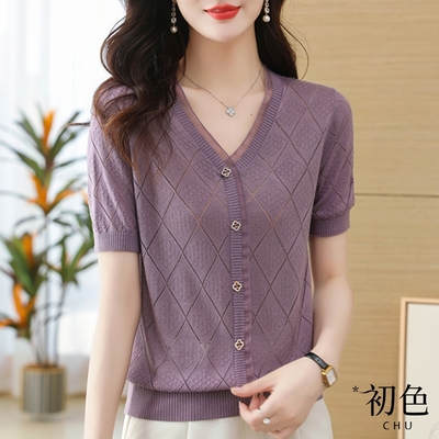 初色 菱格鏤空蕾絲V領短袖冰絲針織涼爽開衫上衣-共4色-68212(F可選)$269