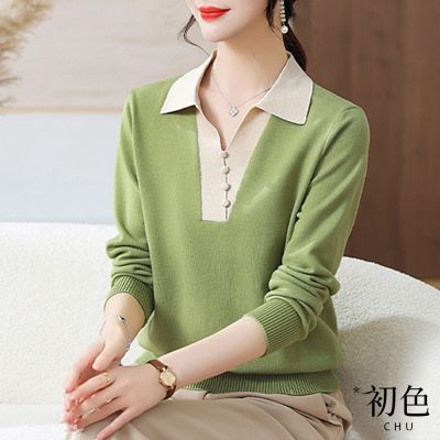 初色 秋季翻領針織薄款長袖上衣-共3色-31400(F可選)