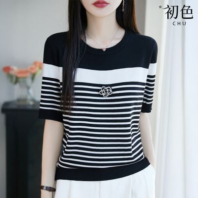 初色 氣質拚色條紋立體小花裝飾天絲短袖冰絲針織衫上衣女上衣-共2色-12454(M-3XL可選)