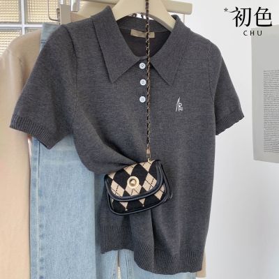 初色 冰絲輕薄透氣迷你刺繡POLO領短袖針織衫POLO衫上衣女上衣-灰色-12847(F可選)