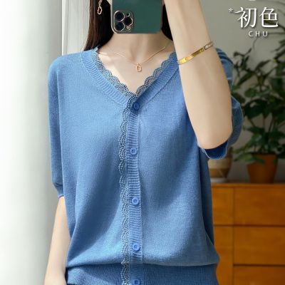 初色 純色簡約蕾絲大碼寬鬆博款V領冰絲針織上衣女上衣-共3色-12848(F可選)