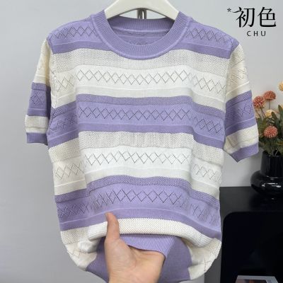 初色 撞色條紋菱格提寬鬆大碼休閒薄款圓領短袖針織上衣女上衣-共3色-12851(F可選)