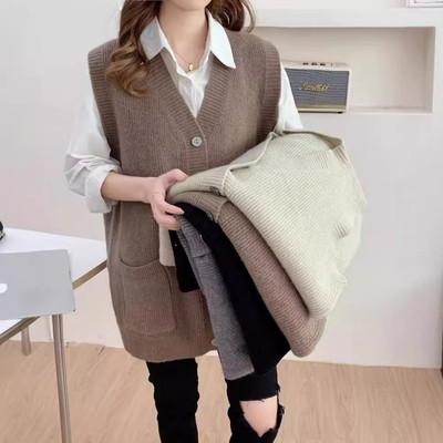 La Belleza簡約減齡V領單排釦寬鬆雙口袋長版毛衣針織背心
