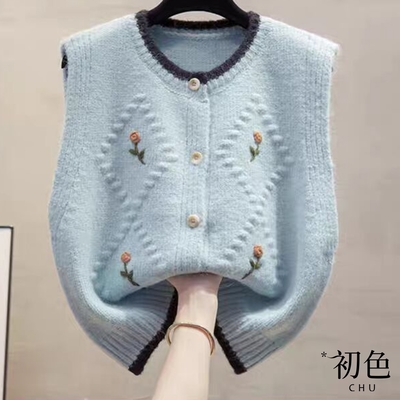 初色 寬鬆素色花邊圓領盤扣無袖針織衫馬甲坎肩背心女背心-共5色-31917(F可選)$62976折