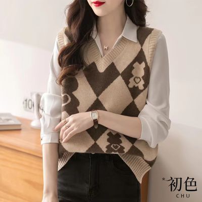 初色 復古菱格卡通減齡休閒百搭V領針織無袖背心馬甲上衣-共4色-31805(F可選)