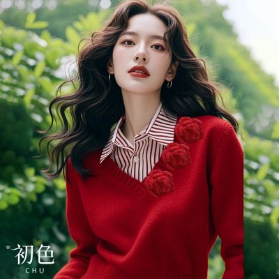 初色 純色V領玫瑰花長袖針織衫毛衣上衣女上衣-紅色-39206(F可選)
