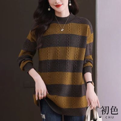 初色 復古風圓領長袖撞色粗條紋毛衣針織衫上衣女上衣-共4色-39710(F可選)
