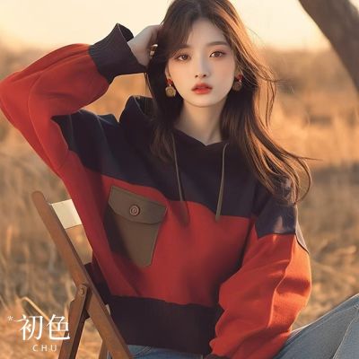 初色 美式復古撞色拼接寬鬆抽繩連帽長袖帽T女上衣-紅黑色-38645(M-2XL可選)