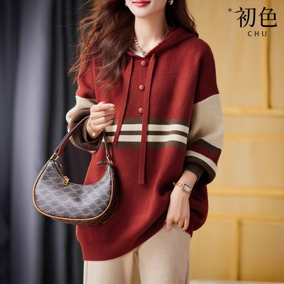 初色 撞色條紋拼接裝飾釦加厚連帽寬鬆長袖針織毛衣上衣女上衣-共2色-38869(F可選)$63176折