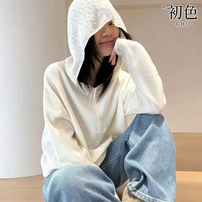 初色 拼色拼接長袖寬鬆針織毛衣抽繩連帽T恤上衣女上衣-共3色-32017(F可選)$6198折